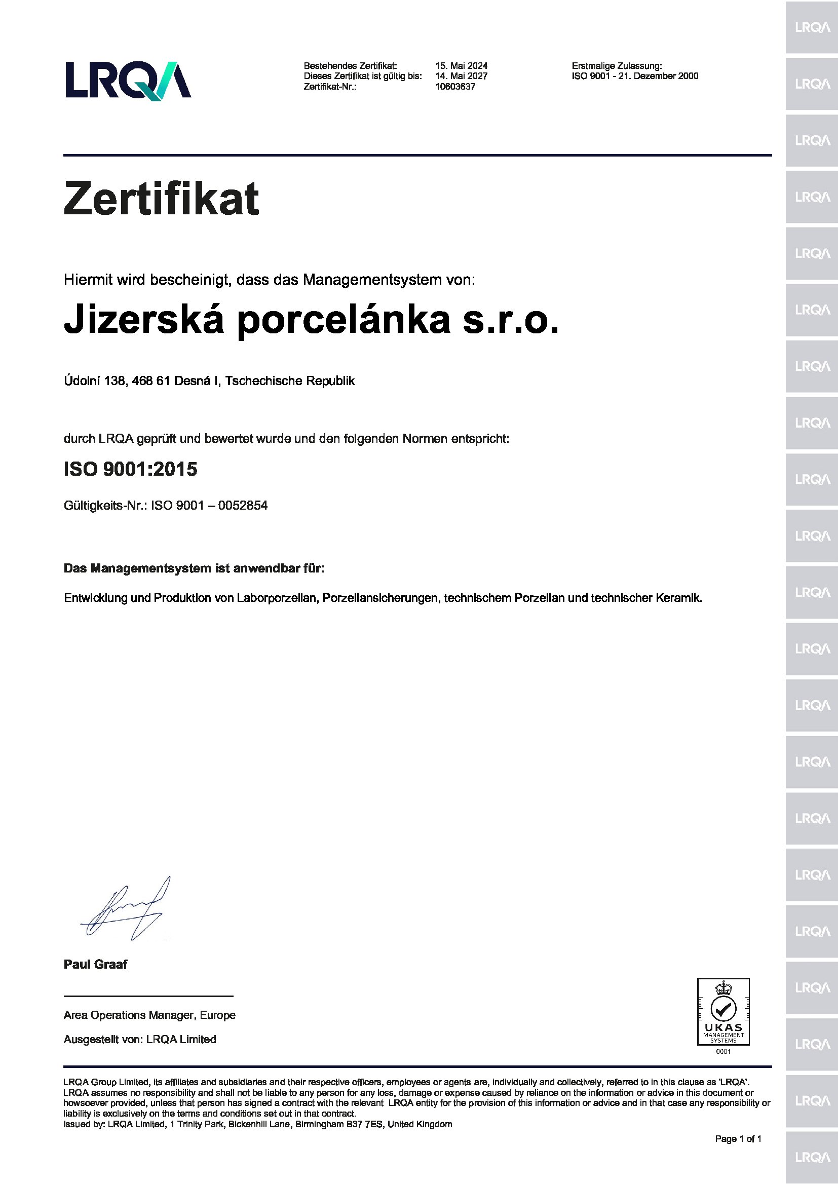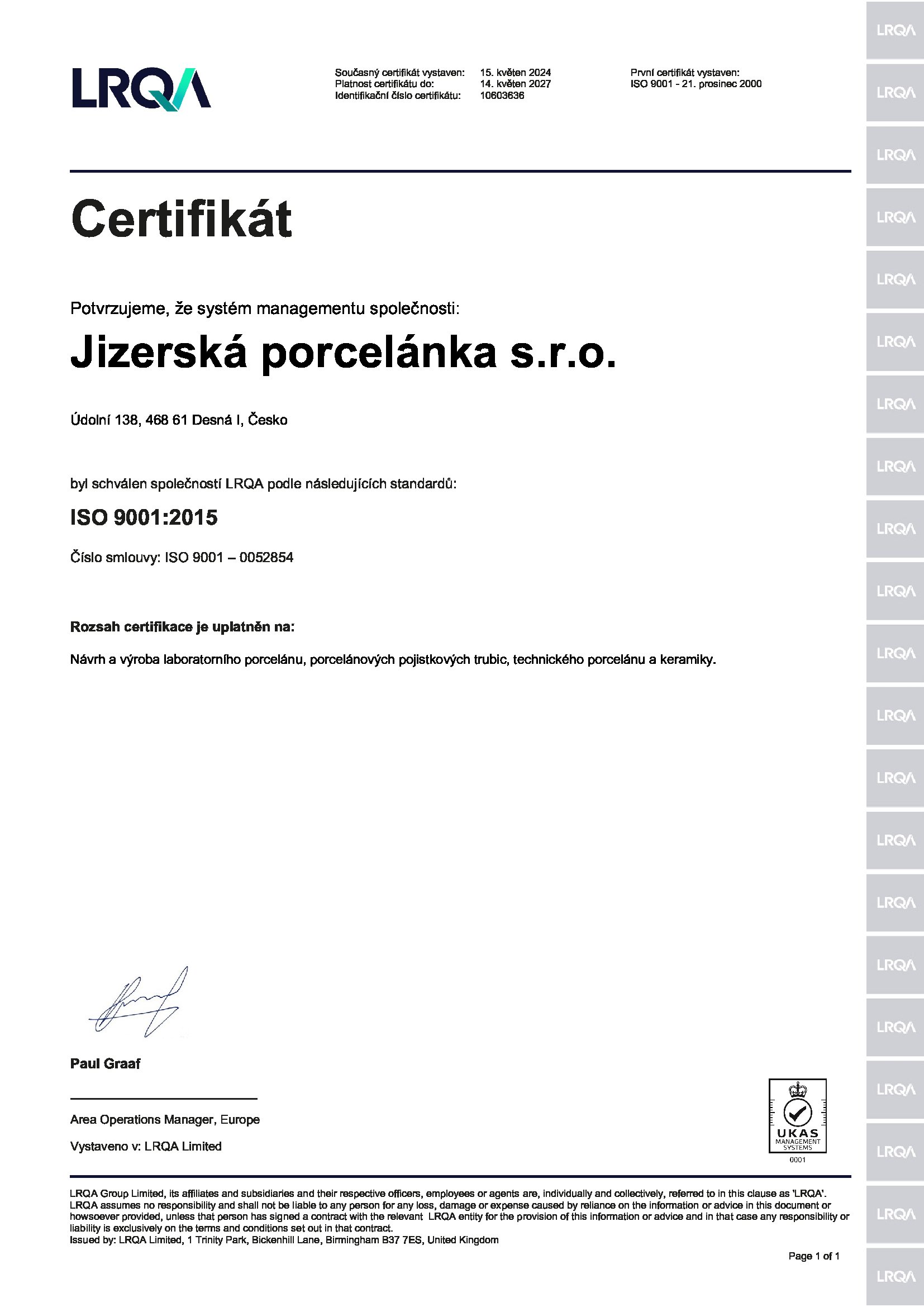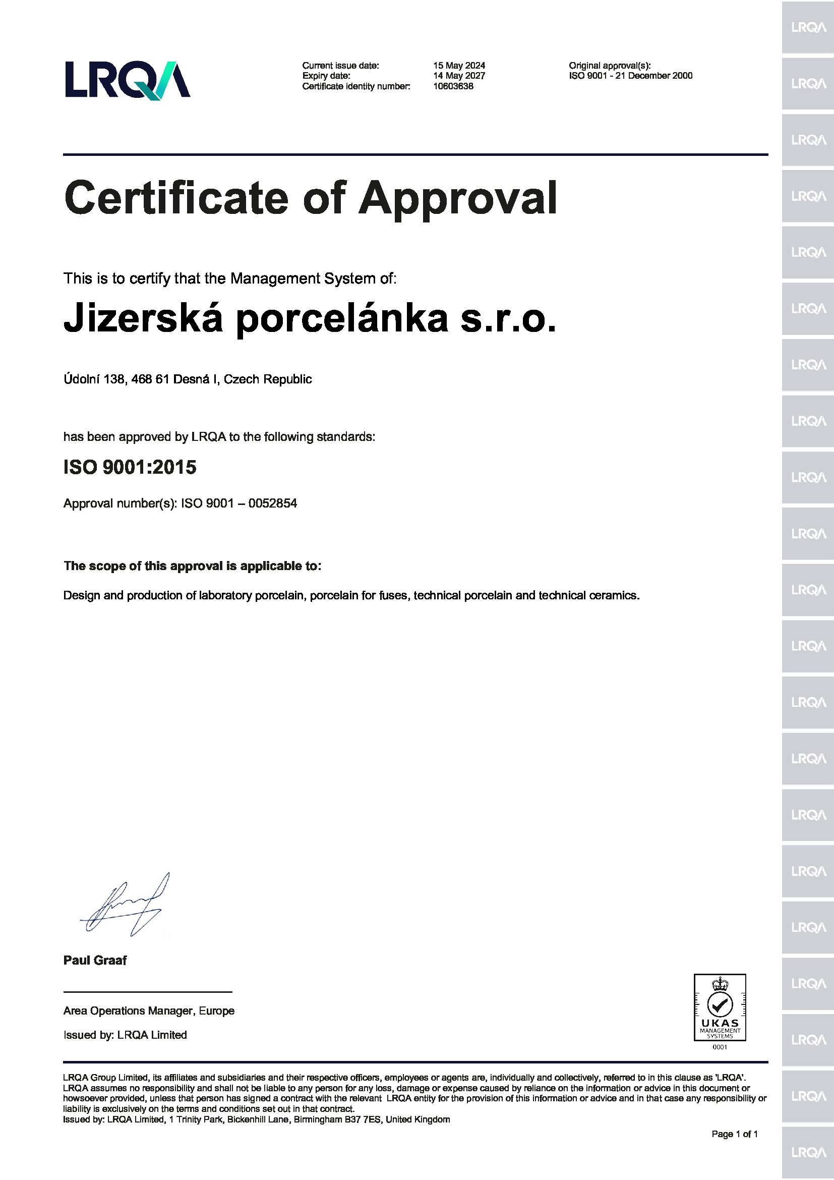 Certificate of production quality management system ISO 9001:2000. Certificate for drawing porcelain materials C110, C120 according to ČSN EN 60672-2:2001; ČSN ISO 7991:1992; ČSN EN 60672-3:1998.